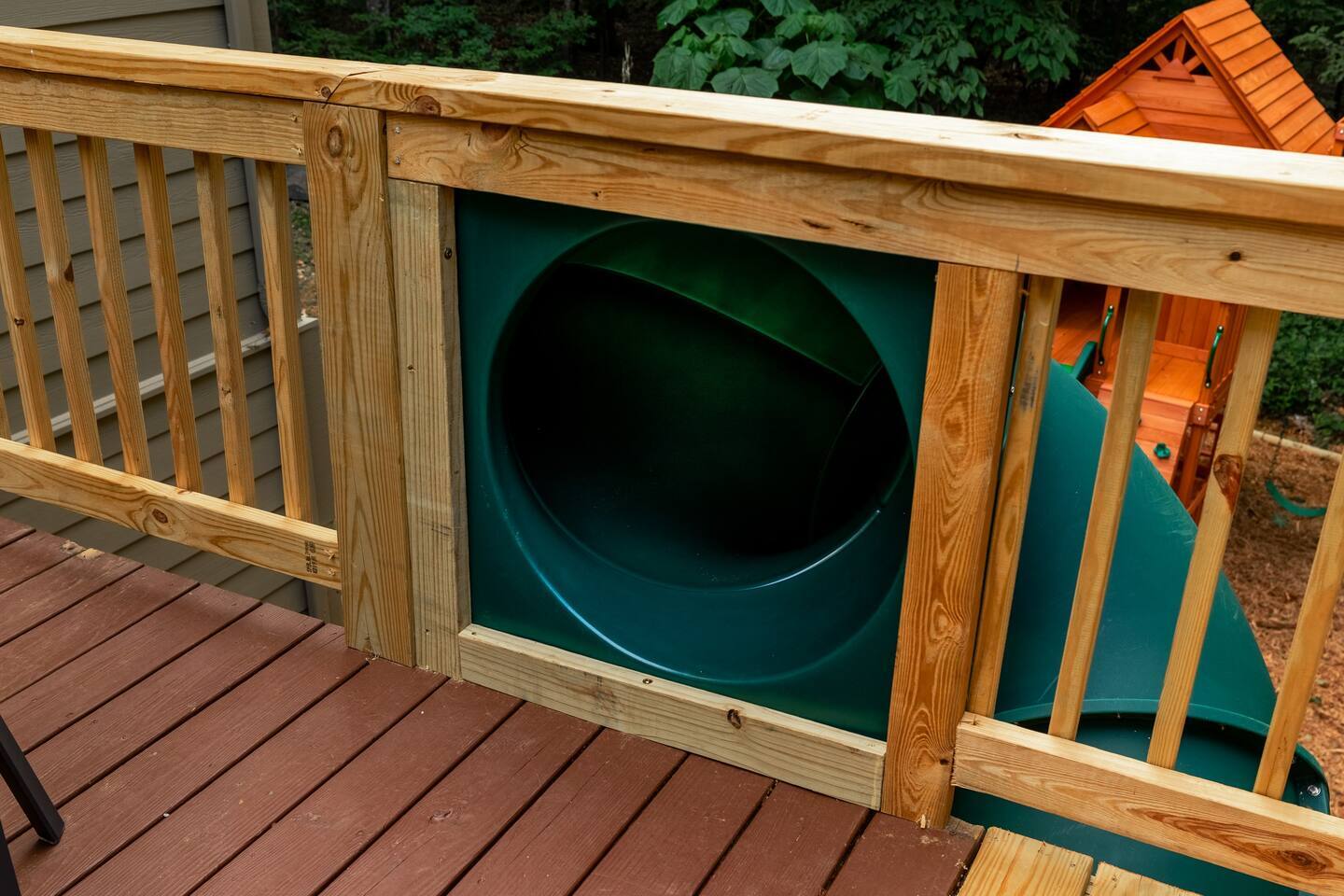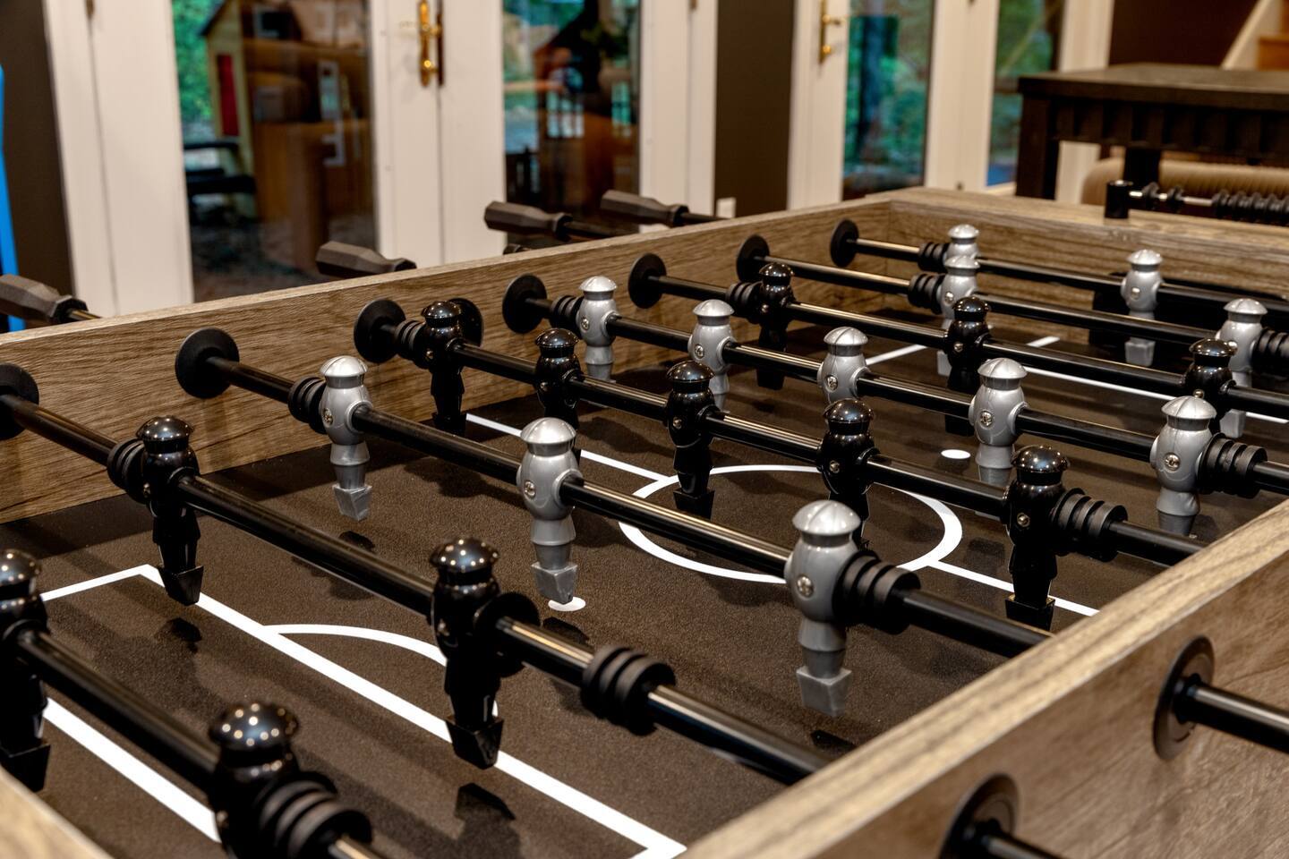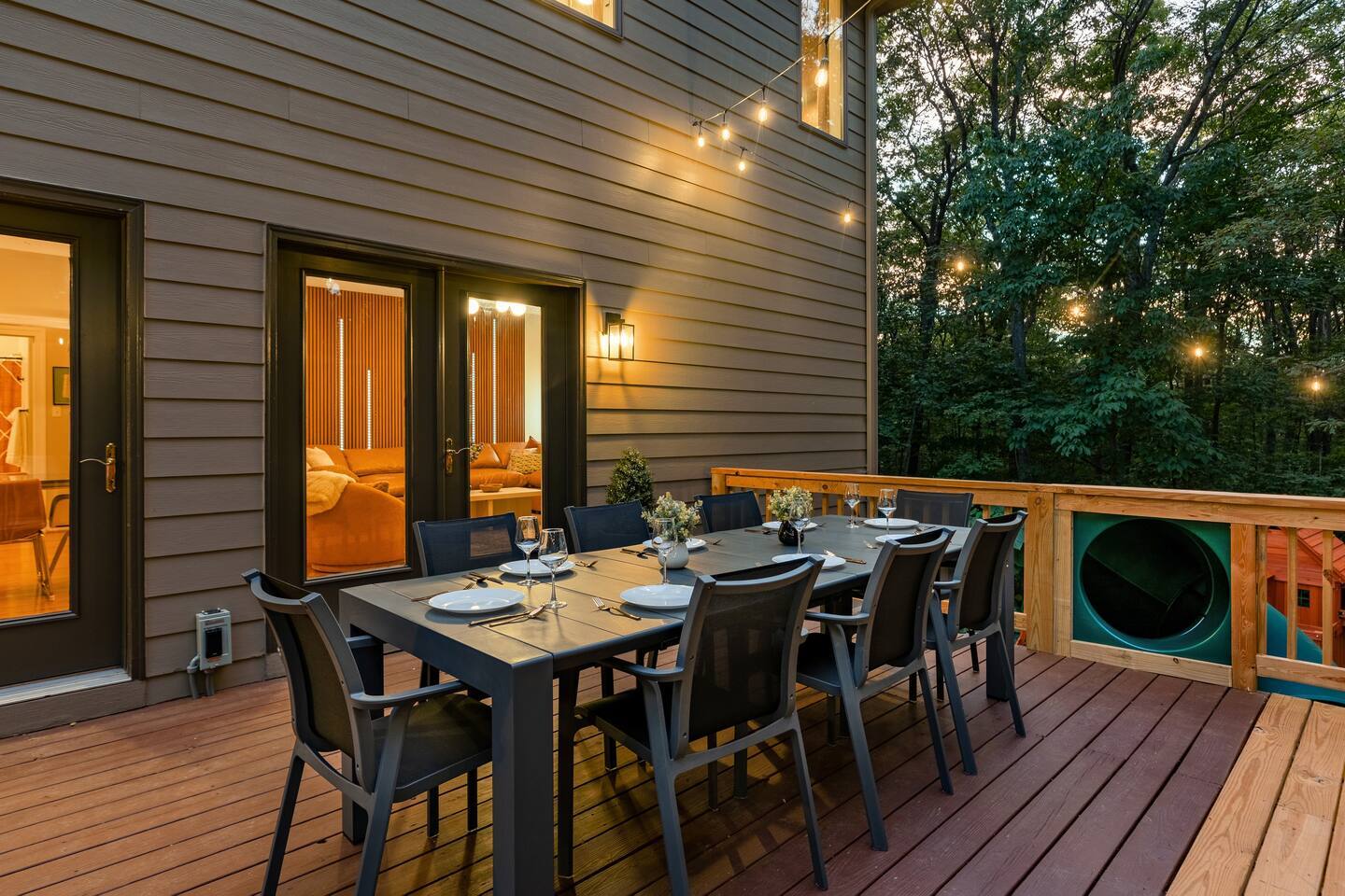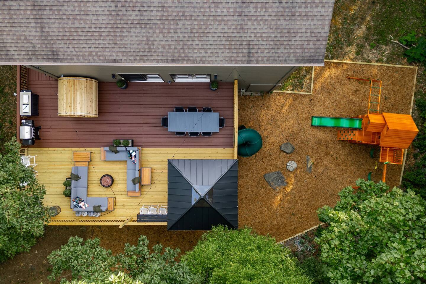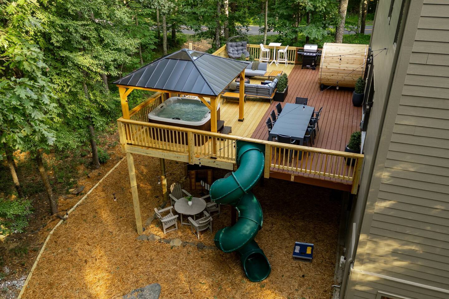 The house is a 5 minute walk to the Tyro ski slope, or feel free to drive 3 minutes down the road to access all the slopes, dining, and other Wintergreen attractions. If you’re willing to venture a bit further, some of the best hiking trails in the state are off the Blue Ridge Parkway (15 minutes from the house), and there are over dozen wineries, breweries, and distilleries within a 30 minute drive. During the summer, enjoy Sherando Lake and Lake Monocan with sandy beach entrances, or take a dip in the heated community pool. The home layout is as follows: Main level: - Living room with working gas log fireplace - Dining area with ample space for 10 at the main table, plus another 4 at the adjoining bar - Fully stocked kitchen with stainless appliances and everything you need to prepare large meals, plus an additional dining area with space for 5 adults or 7 children - BR 1: King bed with Smart TV - Bath 1: Full bathroom that connects both to bedroom 1 and also the living room / dining area - Laundry area with full size washer and dryer - Deck with brand new 7 person hot tub, barrel sauna, couch seating around the firepit, dining for 8, and propane grill with prep table. Plus, spiral slide leading down to the playground! Upper level: - BR 2: Master bedroom with king bed and Smart TV - Bath 2: Ensuite bathroom of bedroom 2. Dual vanity, shower, and separate jetted tub - BR 3: King bed with Smart TV - BR 4: Two queen beds with Smart TV - Bath 3: Full Jack-and-Jill bathroom between BR 3 and 4. Lower level: - Additional living room / game room with big screen TV, seating area, foosball table, 2 arcade machines, rock climbing wall and cargo net, and additional full size refrigerator. - "Game closet" with nerf gun wall, board games, and toddler sensory wall - BR 5: King bed with Smart TV - BR 6: Two sets of twin-over-twin bunk beds (4 beds total) with Smart TV - Bath 4: Full bath in hallway - Under-deck area has our "Toddler Village" with 4 toddler houses plus vehicles, signs, and toys. Also under the deck is a full size cornhole area, hammock, 2 hanging hammock chairs, and a table for 4 - Playset with swings, slide, climbing wall, and monkey bars