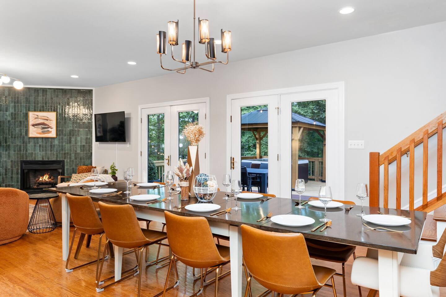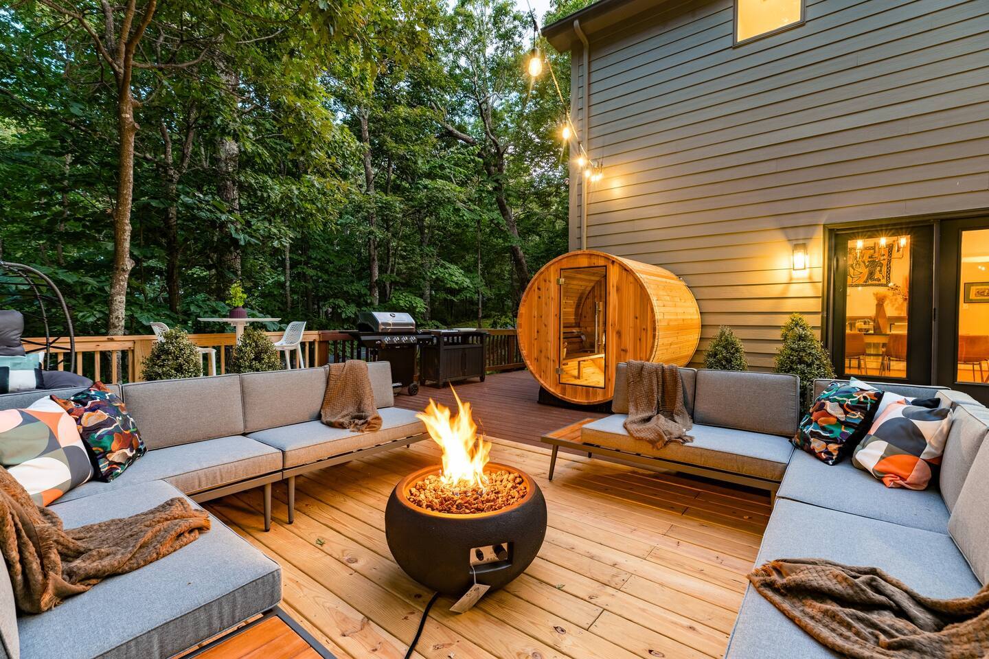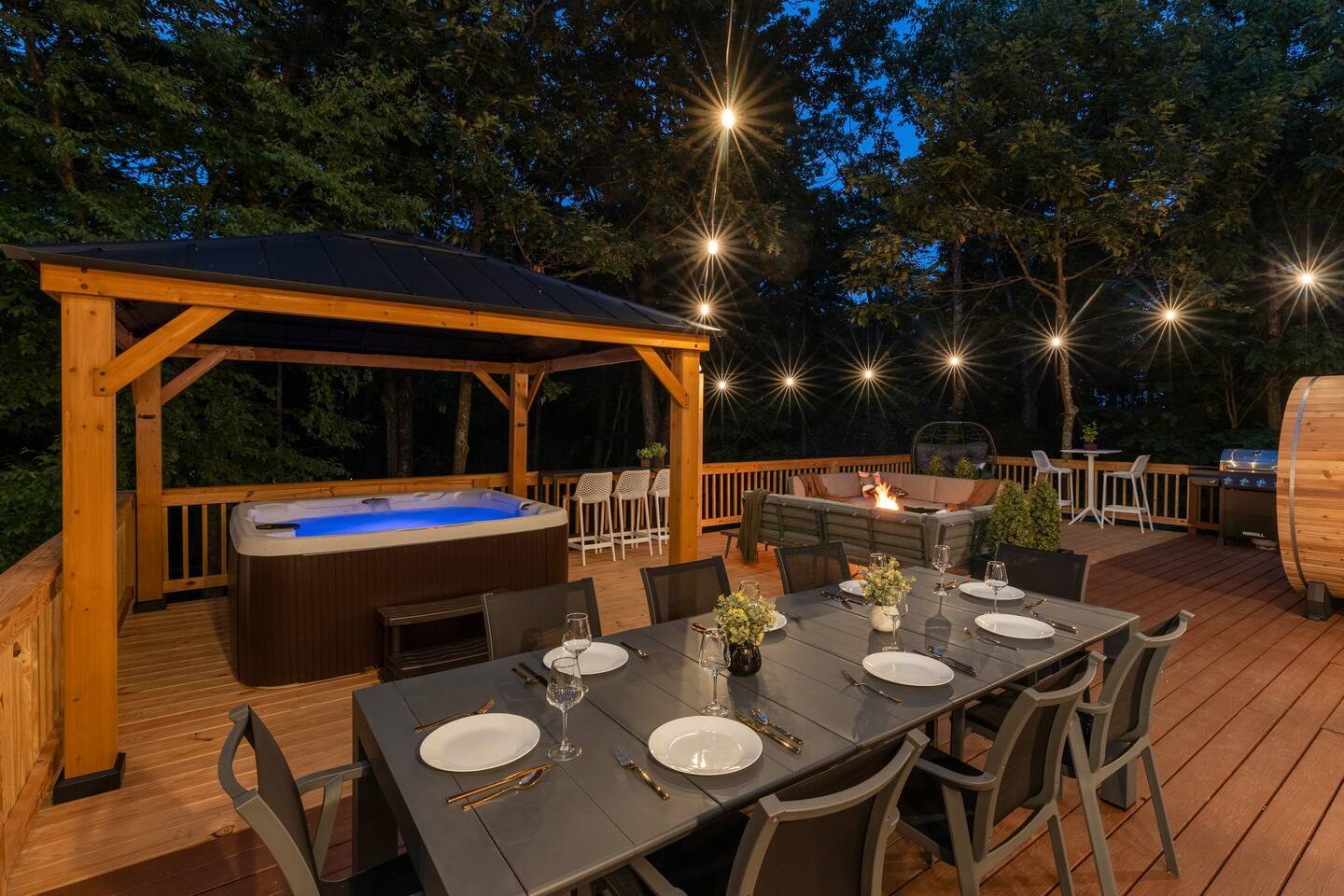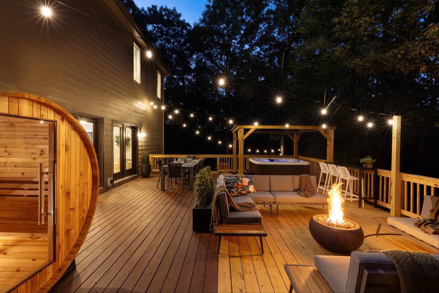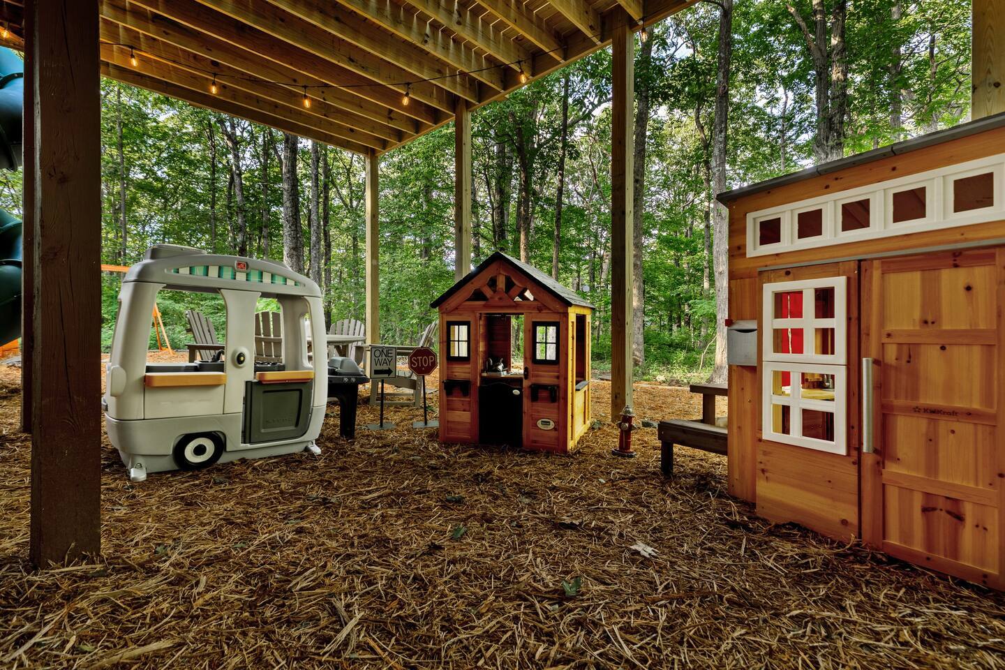 The house is a 5 minute walk to the Tyro ski slope, or feel free to drive 3 minutes down the road to access all the slopes, dining, and other Wintergreen attractions. If you’re willing to venture a bit further, some of the best hiking trails in the state are off the Blue Ridge Parkway (15 minutes from the house), and there are over dozen wineries, breweries, and distilleries within a 30 minute drive. During the summer, enjoy Sherando Lake and Lake Monocan with sandy beach entrances, or take a dip in the heated community pool. The home layout is as follows: Main level: - Living room with working gas log fireplace - Dining area with ample space for 10 at the main table, plus another 4 at the adjoining bar - Fully stocked kitchen with stainless appliances and everything you need to prepare large meals, plus an additional dining area with space for 5 adults or 7 children - BR 1: King bed with Smart TV - Bath 1: Full bathroom that connects both to bedroom 1 and also the living room / dining area - Laundry area with full size washer and dryer - Deck with brand new 7 person hot tub, barrel sauna, couch seating around the firepit, dining for 8, and propane grill with prep table. Plus, spiral slide leading down to the playground! Upper level: - BR 2: Master bedroom with king bed and Smart TV - Bath 2: Ensuite bathroom of bedroom 2. Dual vanity, shower, and separate jetted tub - BR 3: King bed with Smart TV - BR 4: Two queen beds with Smart TV - Bath 3: Full Jack-and-Jill bathroom between BR 3 and 4. Lower level: - Additional living room / game room with big screen TV, seating area, foosball table, 2 arcade machines, rock climbing wall and cargo net, and additional full size refrigerator. - "Game closet" with nerf gun wall, board games, and toddler sensory wall - BR 5: King bed with Smart TV - BR 6: Two sets of twin-over-twin bunk beds (4 beds total) with Smart TV - Bath 4: Full bath in hallway - Under-deck area has our "Toddler Village" with 4 toddler houses plus vehicles, signs, and toys. Also under the deck is a full size cornhole area, hammock, 2 hanging hammock chairs, and a table for 4 - Playset with swings, slide, climbing wall, and monkey bars